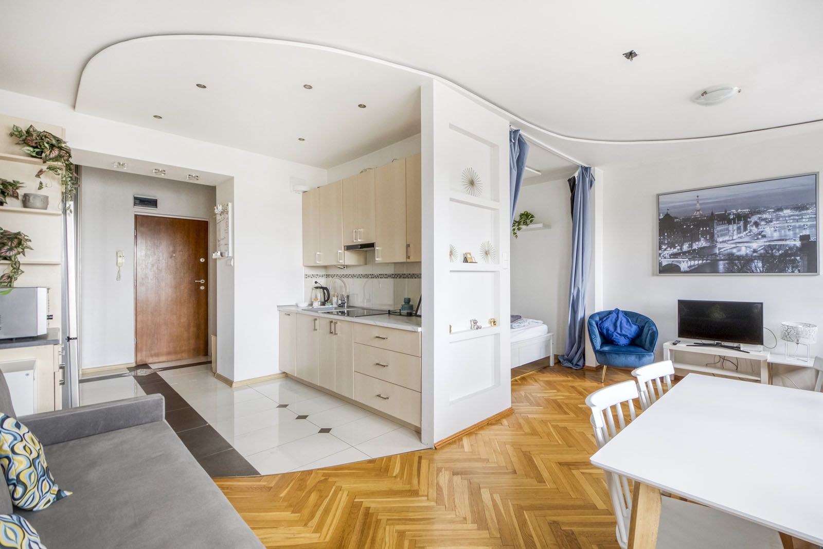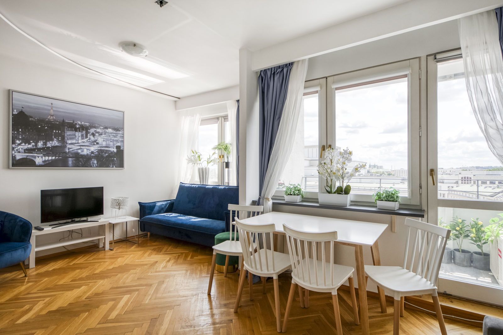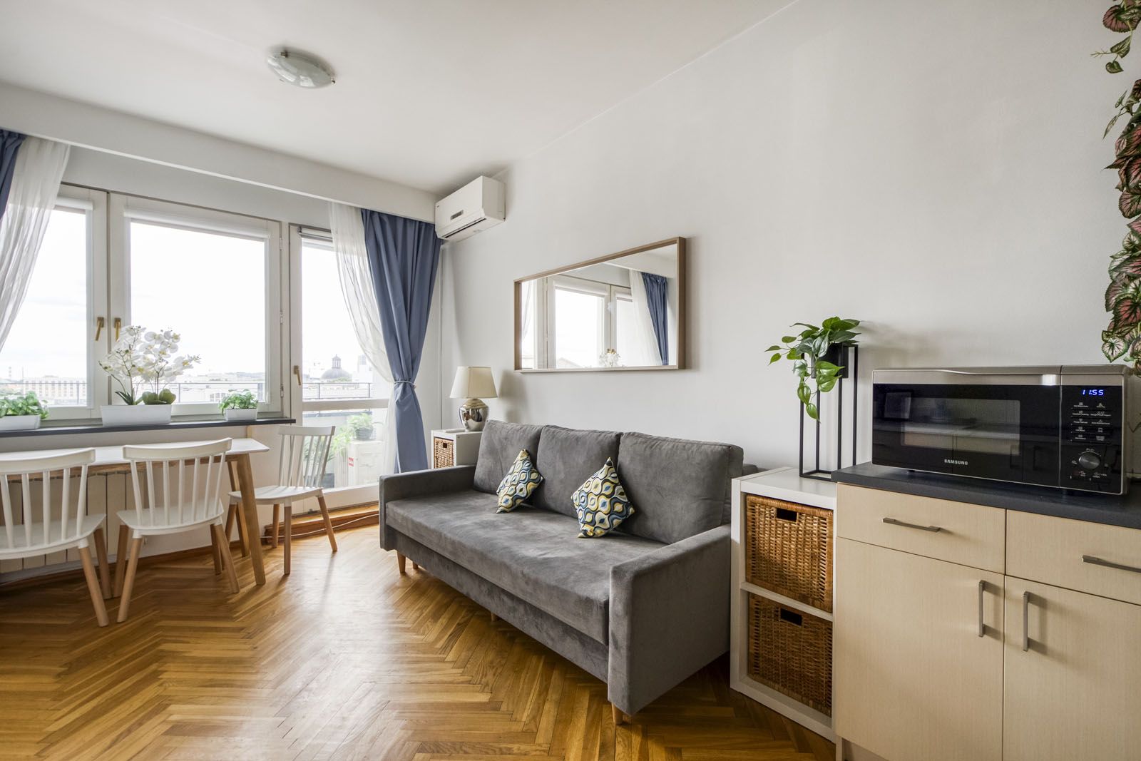 Elegancki i jasny apartament typu studio przeznaczony dla 6 osób. Bogate i nowoczesne wyposażenie (klimatyzacja, smart TV). Balkon z pięknym widokiem na panoramę Warszawy i pobliski Teatr Wielki. Pomimo centralnej lokalizacji oraz bliskości Starego Miasta, cicha i spokojna okolica zapewniająca miejsce do relaksu wśród zieleni (Ogród Saski).