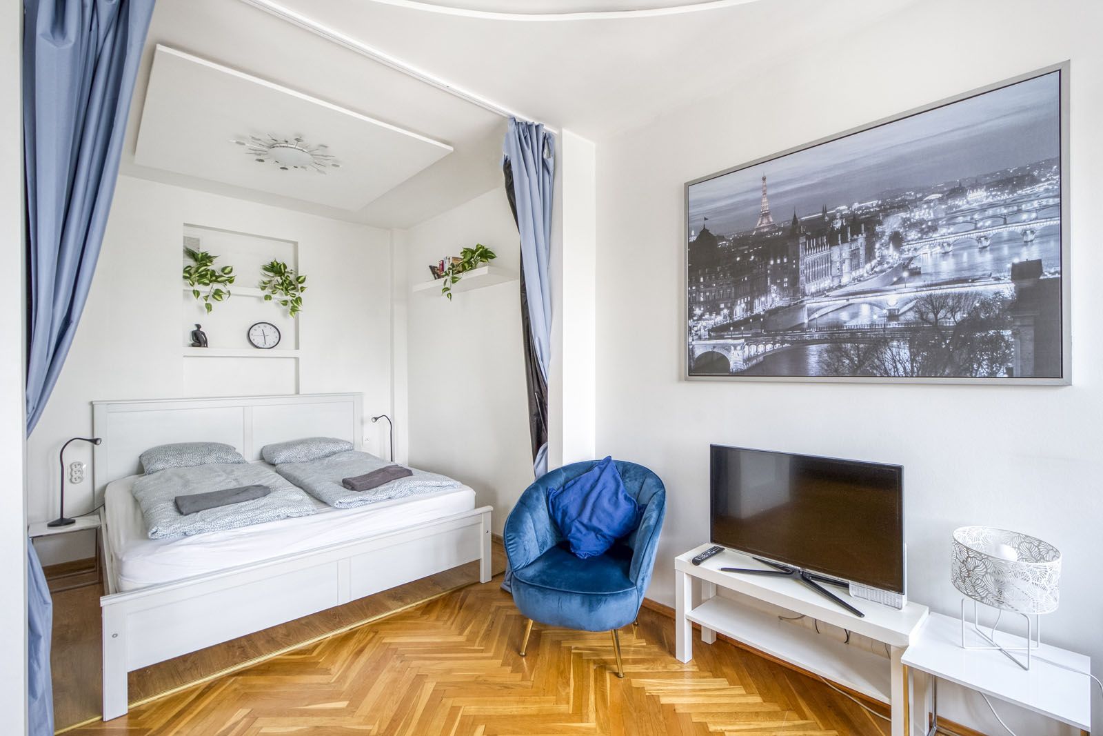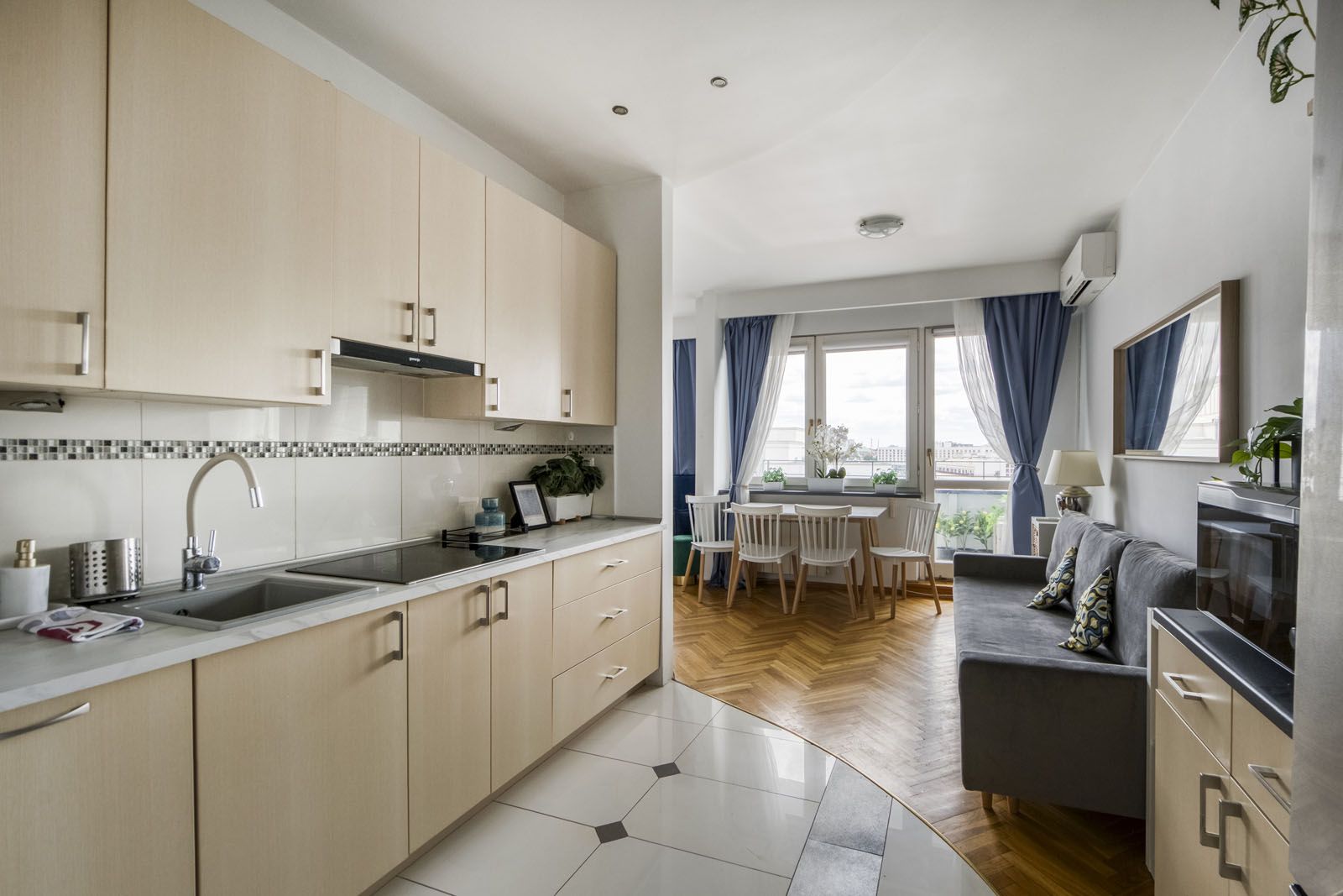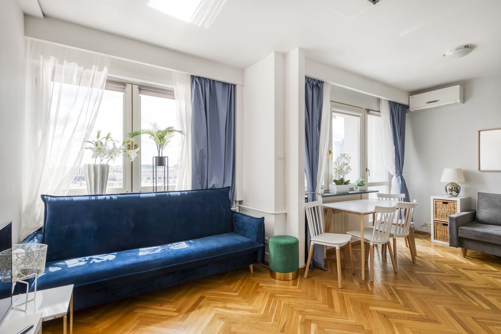 Elegancki i jasny apartament typu studio przeznaczony dla 6 osób. Bogate i nowoczesne wyposażenie (klimatyzacja, smart TV). Balkon z pięknym widokiem na panoramę Warszawy i pobliski Teatr Wielki. Pomimo centralnej lokalizacji oraz bliskości Starego Miasta, cicha i spokojna okolica zapewniająca miejsce do relaksu wśród zieleni (Ogród Saski).